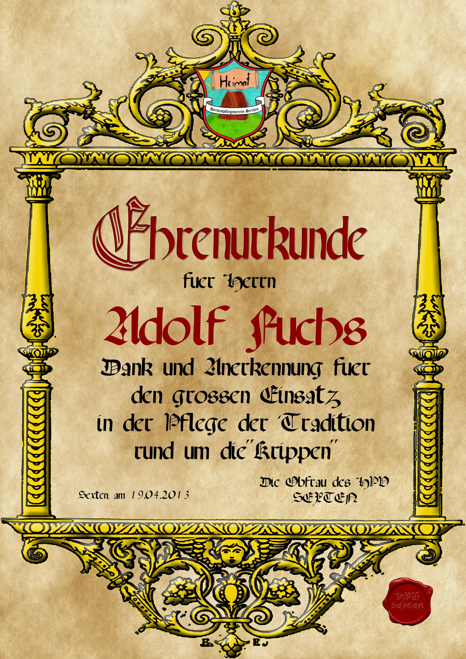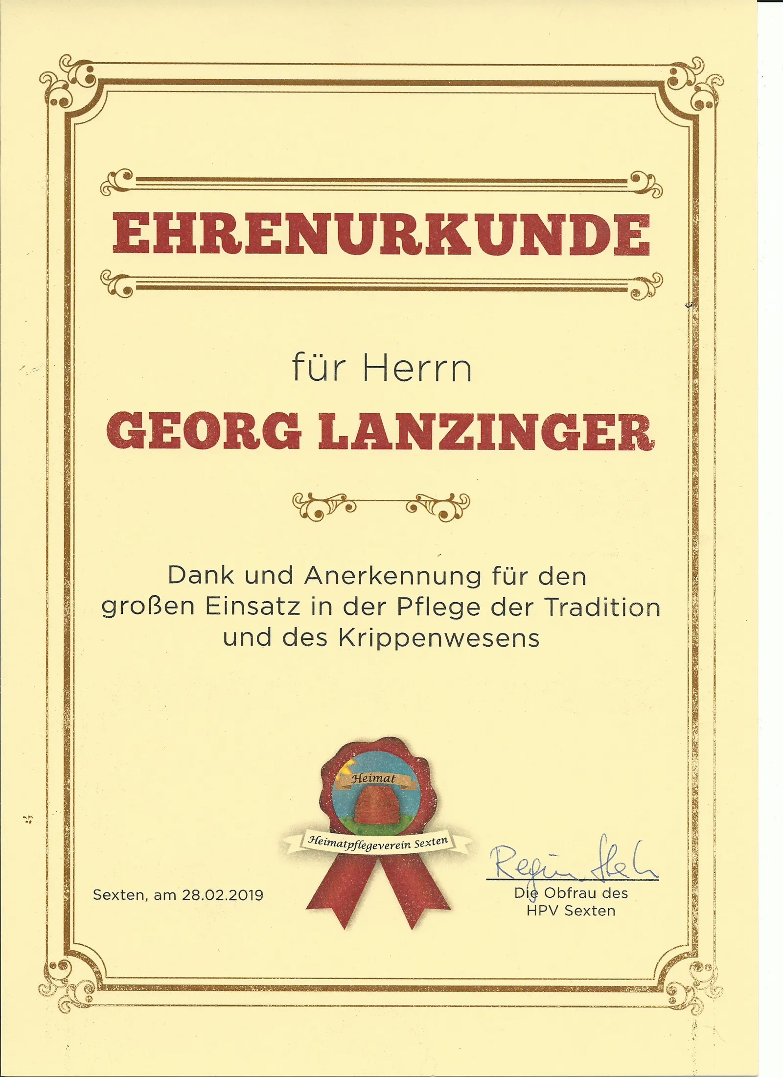 Der HPV verleiht Ehrenurkunden an Persönlichkeiten, die sich um Sexten und seine Kultur besonders verdient gemacht haben.